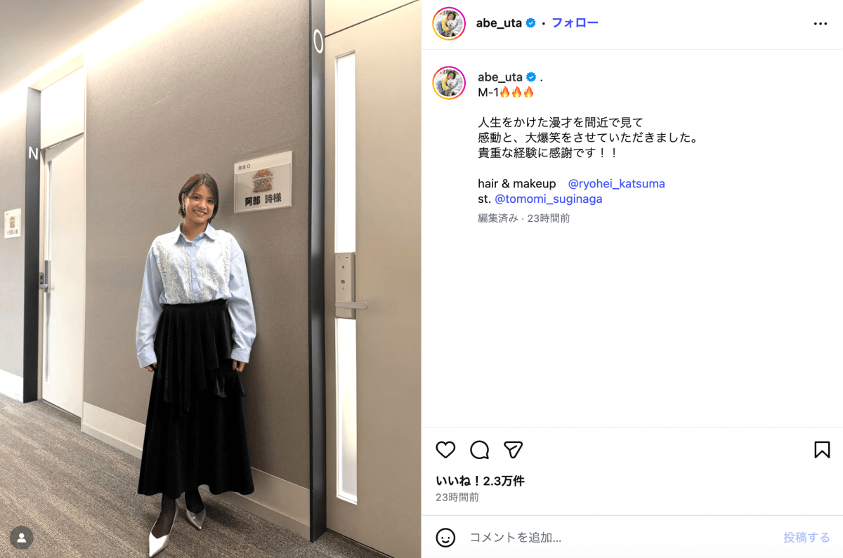 阿部が公開したのは「阿部 詩様」と書かれた控室の前に立つ1枚の写真だ。阿部はレースが装飾された水色のブラウスにネイビーのスカートを合わせ、カメラに向かって笑顔を見せている。阿部は番組内で芸人らがネタを披露する順番が決まるクジを引く大役を務めた。さらに番組について「人生をかけた漫才を間近で見て感動と、大爆笑をさせていただきました」と感想を綴っている。最後は「貴重な経験に感謝です!!」とコメントし、投稿を締め括った。