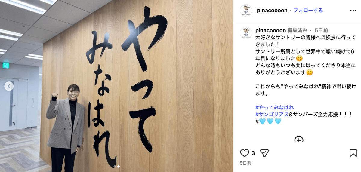 「大好きなサントリーの皆様へご挨拶に行ってきました! サントリー所属として世界中で戦い続けて6年目になりました」と投稿されたのは、渋野がサントリーのロゴの前でほほ笑む写真。そのほか、創業者の口癖「やってみなはれ」が描かれた壁の前でガッツポーズを見せる写真も投稿された。