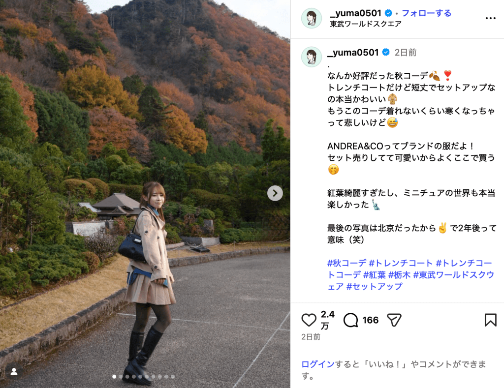 山本は「トレンチコートだけど短丈でセットアップなの本当かわいい もうこのコーデ着れないくらい寒くなっちゃって悲しいけど」とつづり、「紅葉綺麗すぎたし、ミニチュアの世界も本当楽しかった」と感想をコメントした。