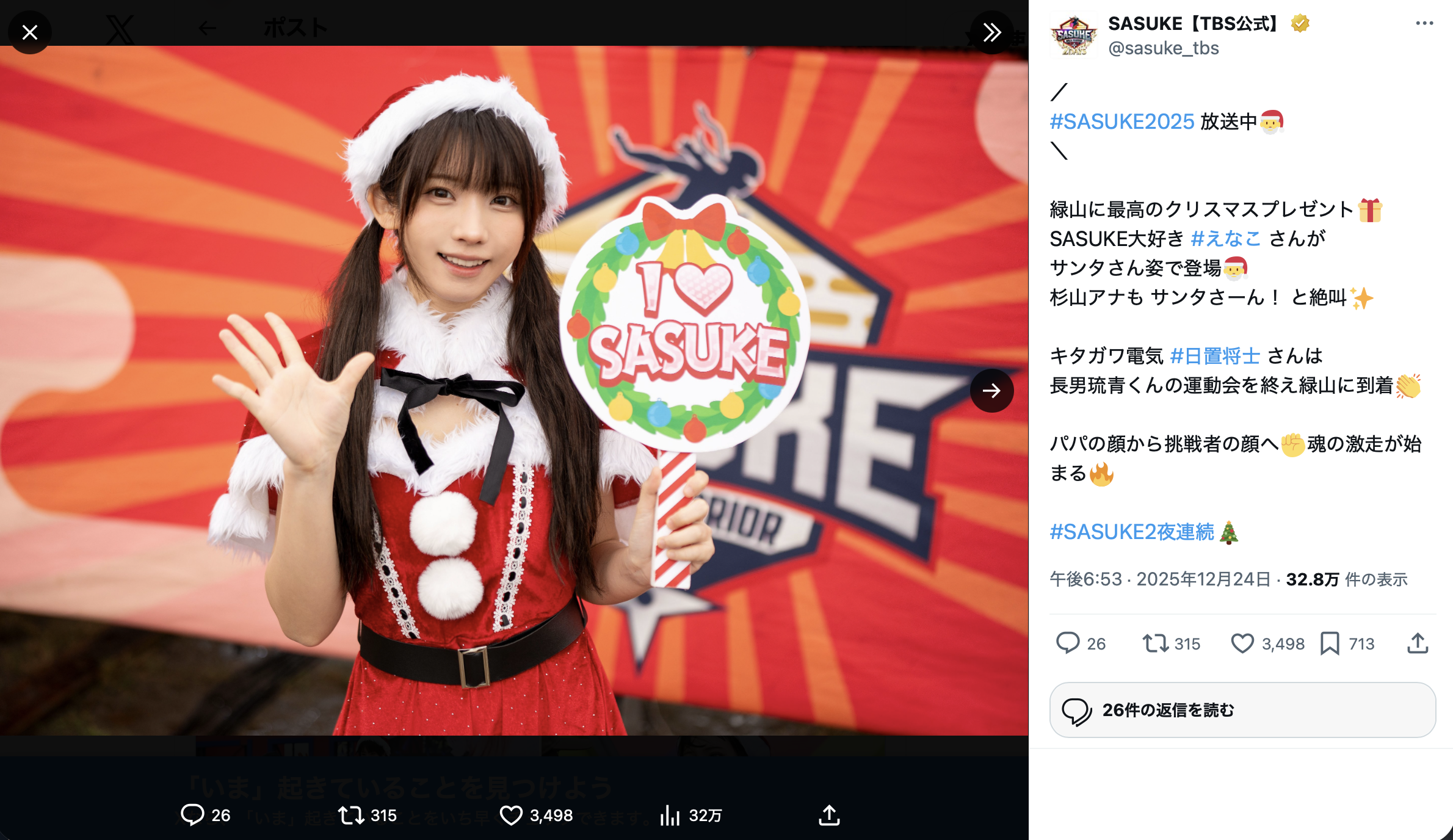 えなこ、ミニスカサンタで「SASUKE」挑戦も開始5秒で“ずぶ濡れ”に…「早すぎやろ」「濡れた後も可愛い!」