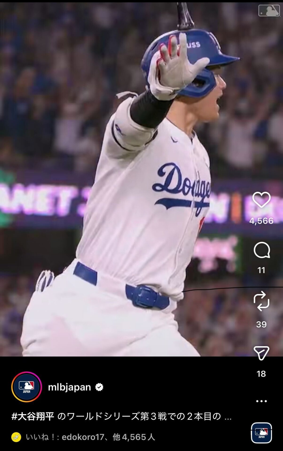 バットフリップとは、本塁打になると確信した打者が、バットを高く放り投げる行為を指すもの。投稿された動画は、大谷がワールドシリーズ第3戦で2本目の本塁打を放ったシーンだ。相手投手から快音を響かせ走り出した大谷は、雄たけびを上げながら、黒のバッドを宙へと放った。観客が総立ちとなる様子から、その熱狂が伝わってくるプレーだ。