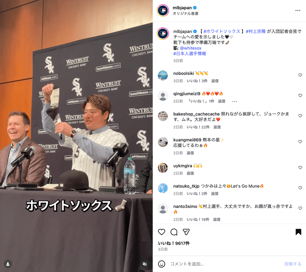 投稿された映像では、ホワイトソックスのユニホーム姿で登場した村上が英語による挨拶を披露。「You guys are in my heart」と、左胸に手を当ててファンへの思いを語った後、靴下を取り出し「ホワイトソックス!」と紹介すると、会場には笑いが広がった。照れ混じりのユーモアを織り交ぜた、村上らしさが伝わる場面となっている。