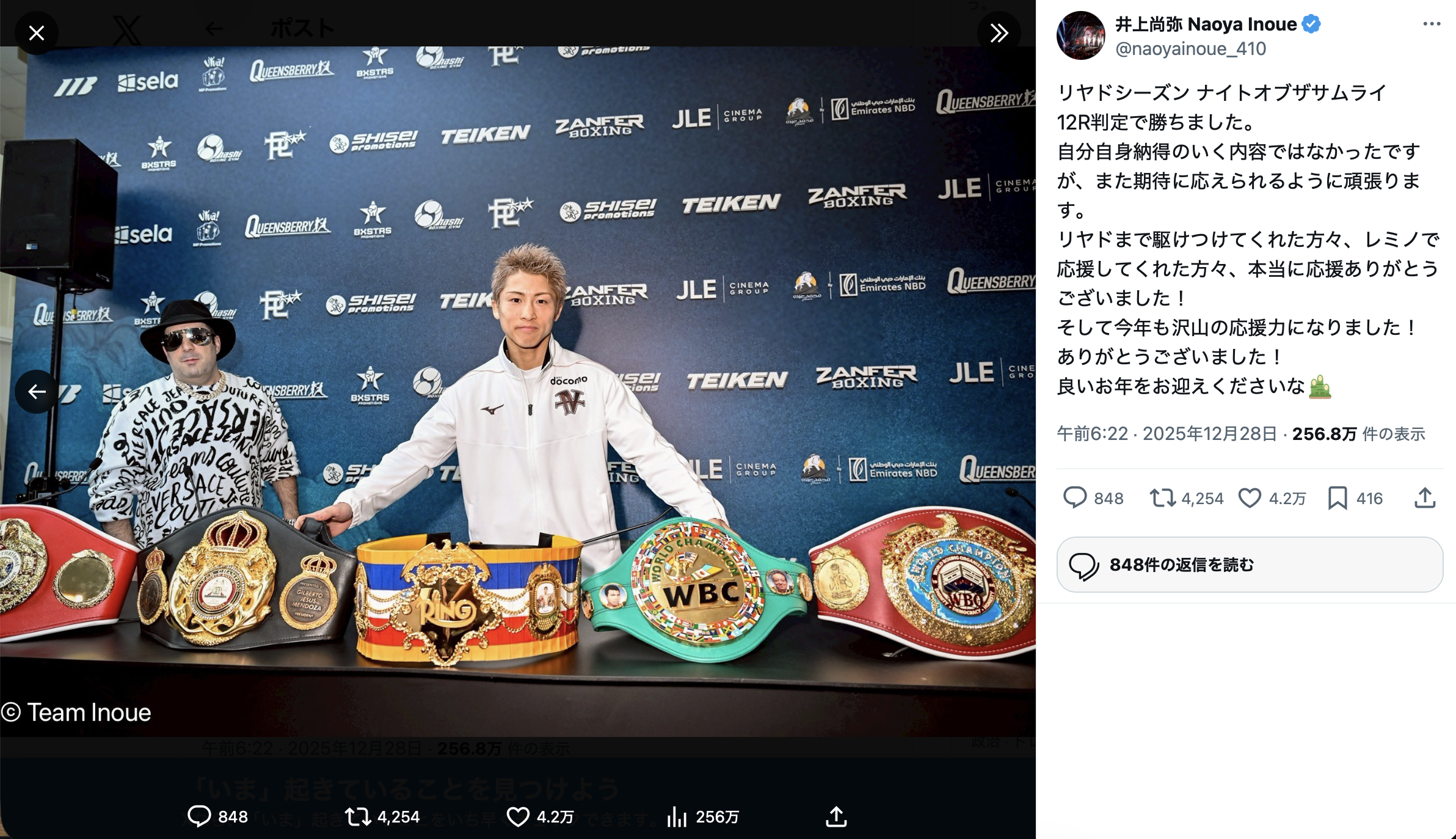 井上尚弥、「カッコ良すぎる」「さすがモンスター」 サウジ防衛戦完勝で世界戦27連勝!