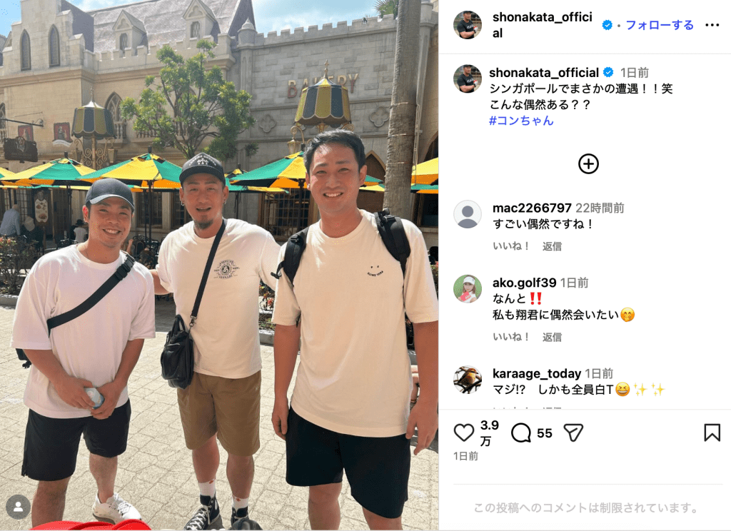 「こんな偶然ある??」中田翔、シンガポール旅行中に元チームメイトと偶然の再会