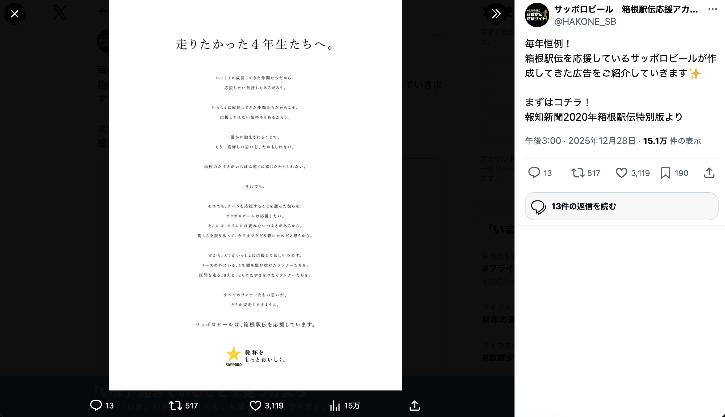 サッポロビールの箱根駅伝広告に「こんなん泣くって」「よく分かってますなぁ!」 毎年恒例の企画に絶賛の声