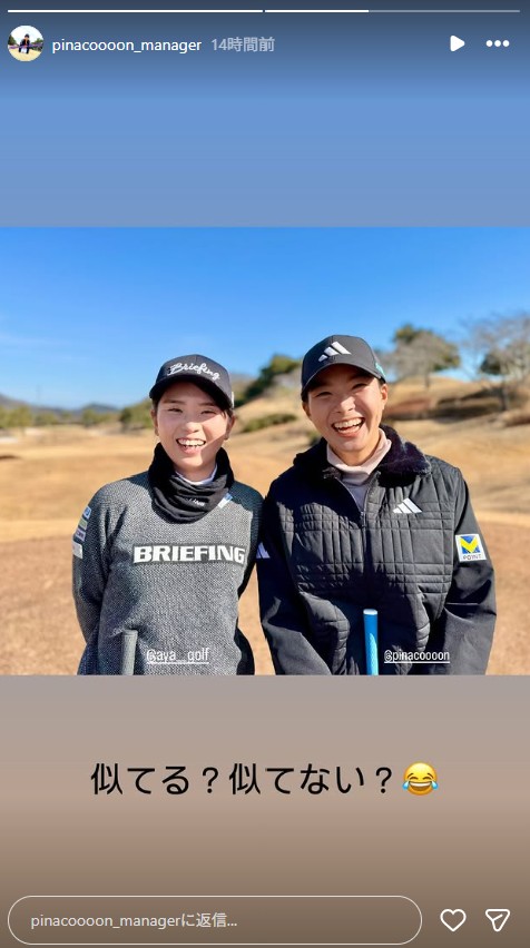 投稿されたのは、渋野と木下がゴルフ場でカメラに向かってほほ笑む写真。グレーのキャップとトップスの色味が似ていることもあり、姉妹のようなそっくりさになっている。マネージャーは「似てる?似てない?」と涙を流して笑う絵文字をつけてコメントした。