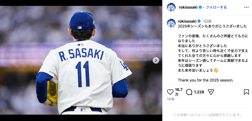 「2025年シーズンもありがとうございました」と投稿されたのは、佐々木がドジャースのユニフォームで背中を見せる様子。佐々木は「ファンの皆様、たくさんのご声援とても力になりました本当にありがとうございました そして、何より苦しい時も近くで全力で支えてくれた全ての方々に心から感謝します」「来年はシーズン通してチームに貢献できるように頑張ります また来年会いましょう」と英訳を添えて締めくくった。
