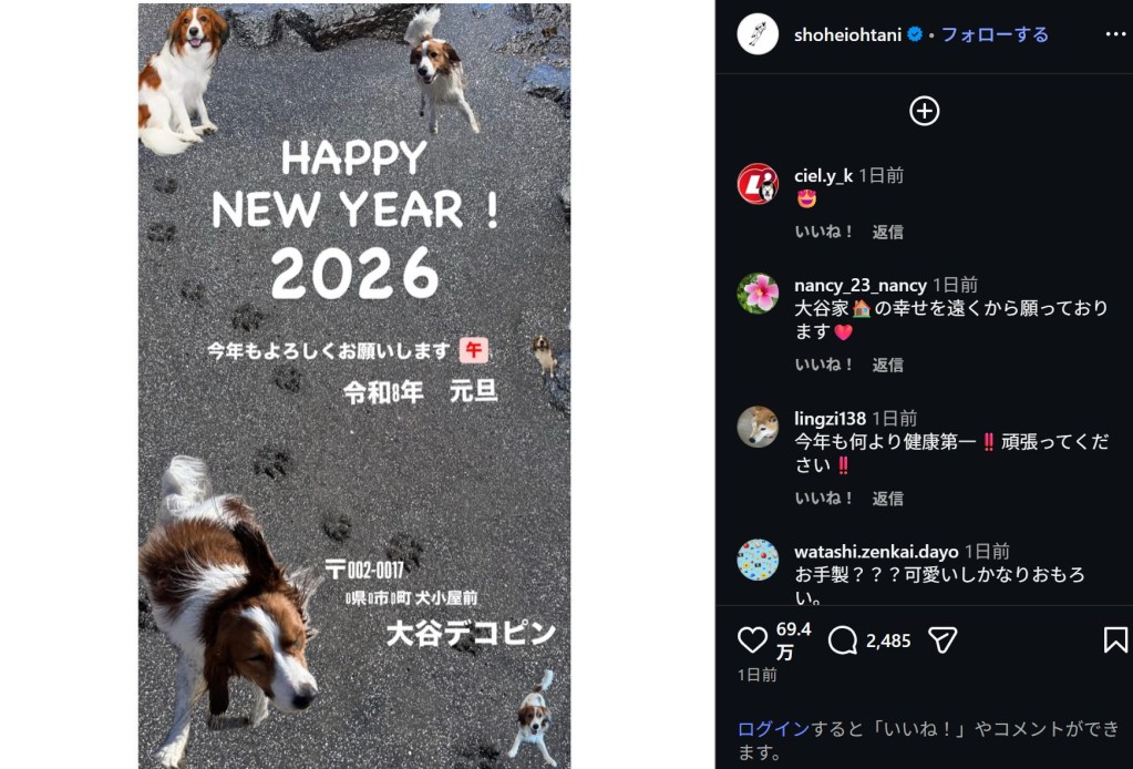 この投稿には、Instagramユーザーから「大谷デコピン様 御家族様 Happy New Year !」「デコピンあけおめ」「今年もワンだふるな一年だといいね」「賢いデコ君 2026もお元気でね」といった新年らしい温かいコメントが寄せられた。