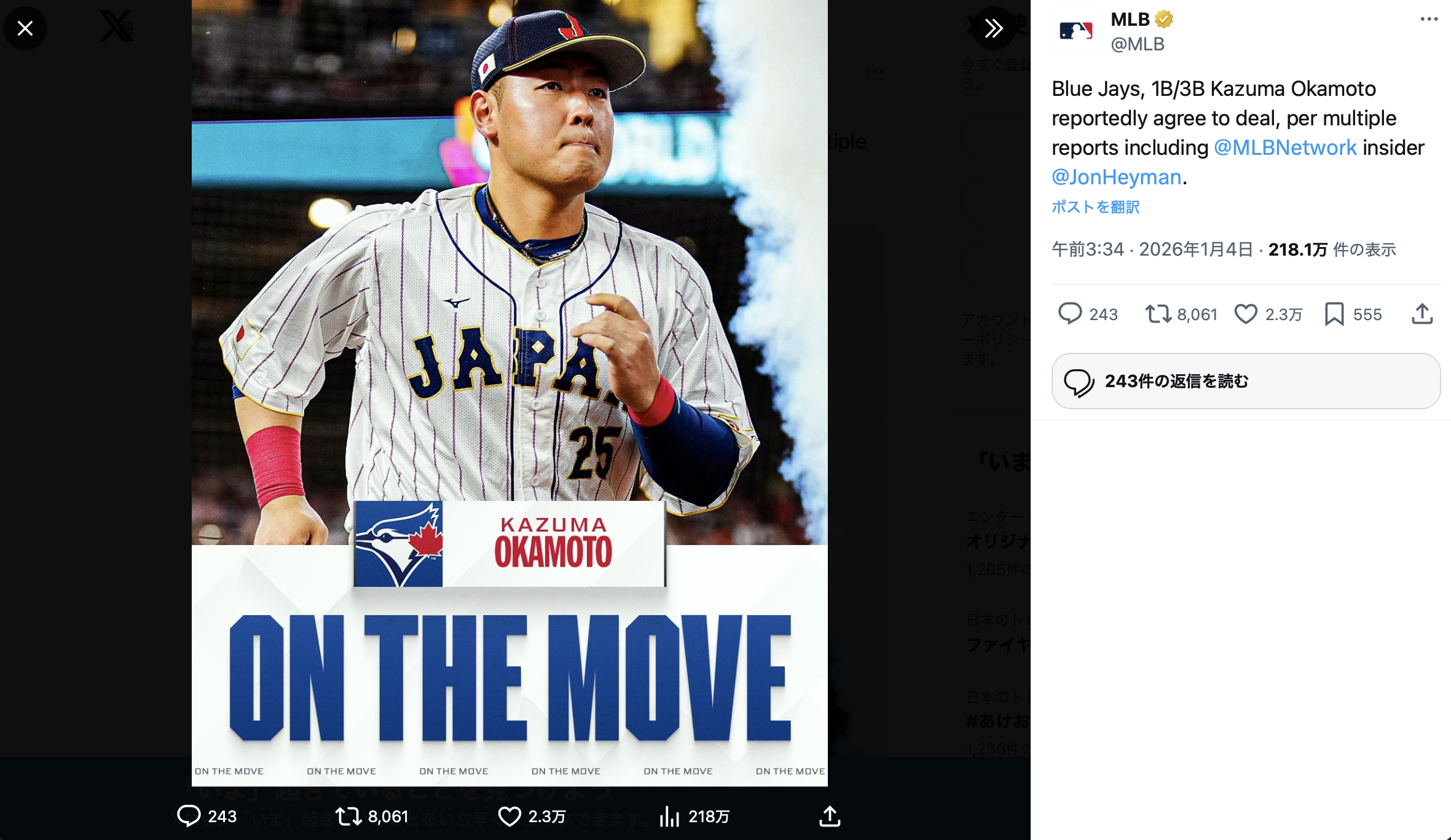 岡本和真、ブルージェイズと契約合意 「ゲレーロJr.らとの夢の共演が楽しみ」「ガチでWSチャンピオン狙える」と期待の声