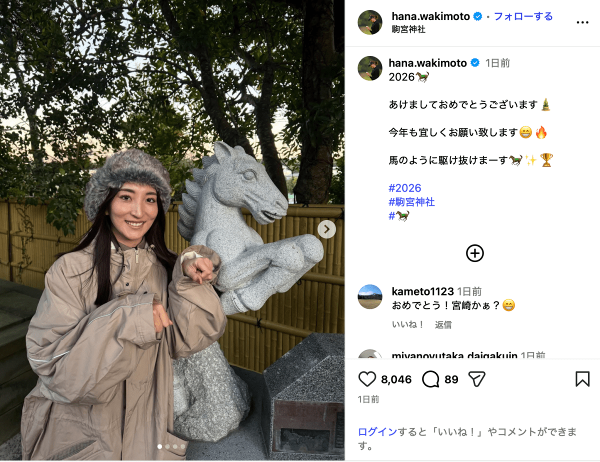 「2026 あけましておめでとうございます」と投稿されたのは、地元である宮崎県の駒宮神社を訪れ、馬の石像の前に立つ脇元の姿。馬が前足を上げるポーズをモノマネし、カメラに向かって笑顔を見せた。脇元は「今年も宜しくお願い致します 馬のように駆け抜けまーす」と締めくくった。