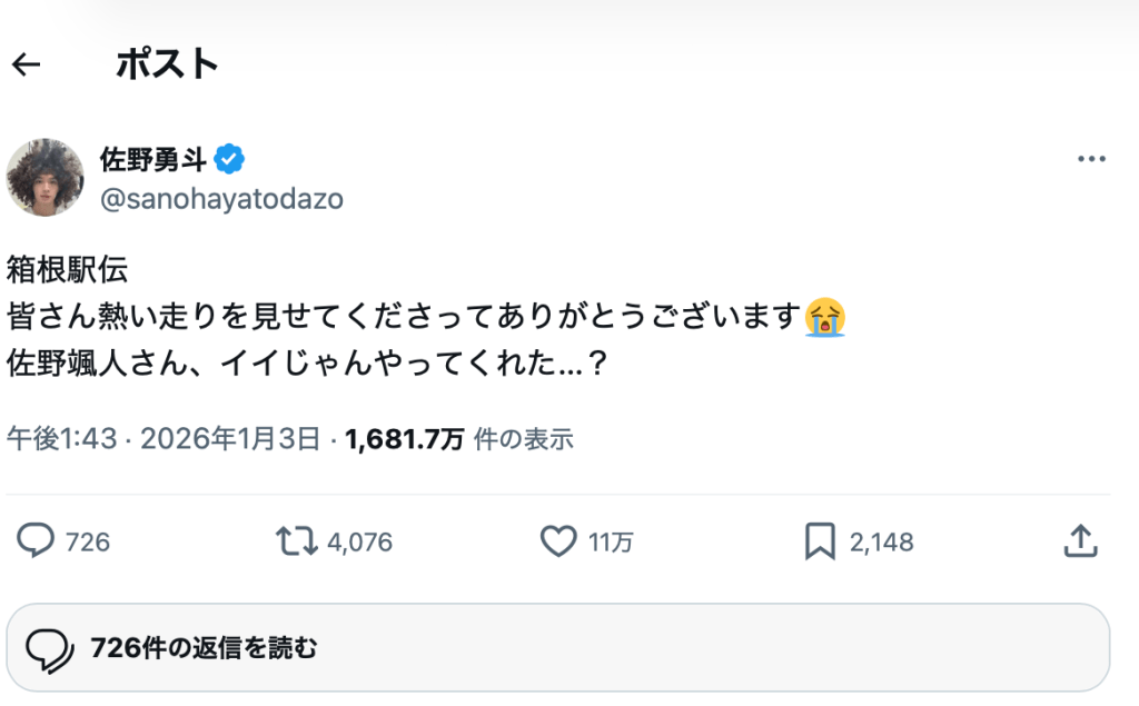 このポーズに佐野と同姓で同じ名前の読み方である「M!LK」の佐野勇斗(27)がXで反応。「箱根駅伝 皆さん熱い走りを見せてくださってありがとうございます 佐野颯人さん、イイじゃんやってくれた…?」と感慨深そうに投稿した。