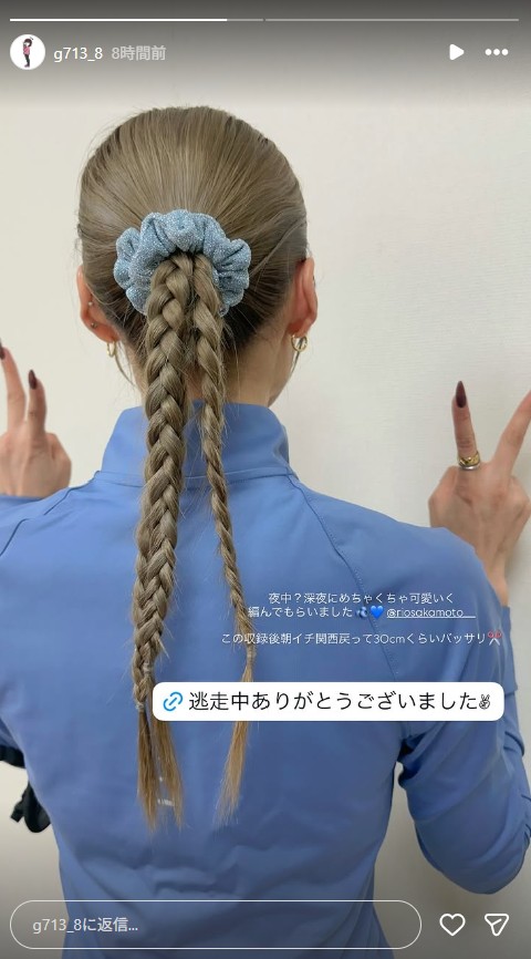 公開された画像は、番組出演時にセットされた後ろ姿の編み込みヘアを写した一枚。すっきりとまとめられた長い三つ編みが印象的で、競技中とは異なる華やかな雰囲気をまとっている。投稿では「深夜にめちゃくちゃ可愛く編んでもらいました」と振り返りつつ、「この収録後、朝イチ関西戻って30cmくらいバッサリ」と大胆カットを報告している。