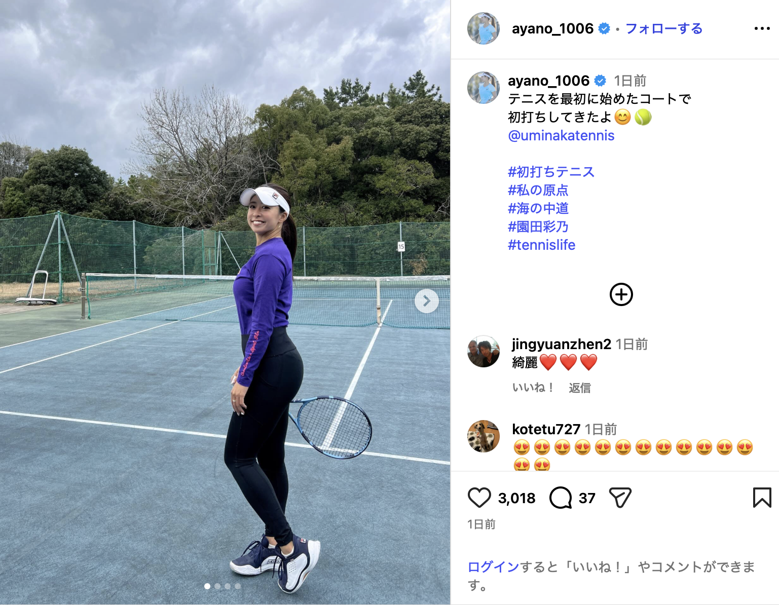 園田彩乃、思い出のテニスコートを訪れ笑顔で記念撮影 “ピチピチ”ウェアに「見事」「脚が長くてスタイル抜群」と絶賛の声