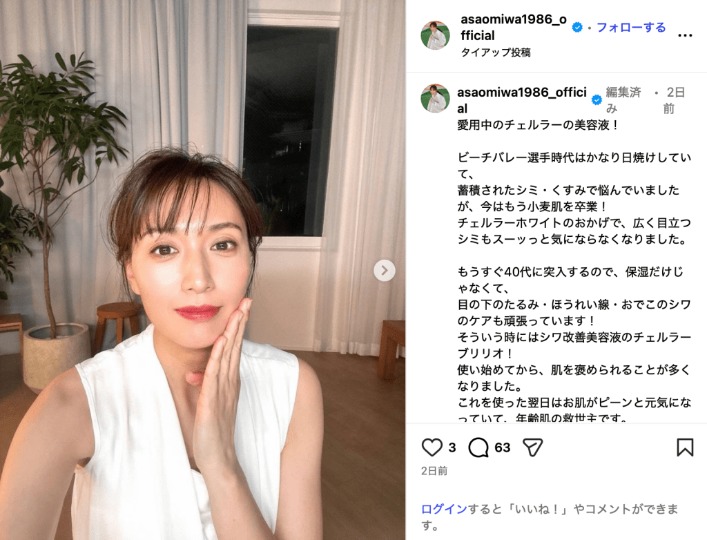 公開されたのは、白のトップスを着用し、頬に手を当てた浅尾のショット。「ビーチバレー選手時代はかなり日焼けしていて、蓄積されたシミ・くすみで悩んでいましたが、今はもう小麦肌を卒業!」とつづり、「もうすぐ40代に突入するので、保湿だけじゃなくて、目の下のたるみ・ほうれい線・おでこのシワのケアも頑張っています!」と伝えた。浅尾は2012年に現役を引退している。