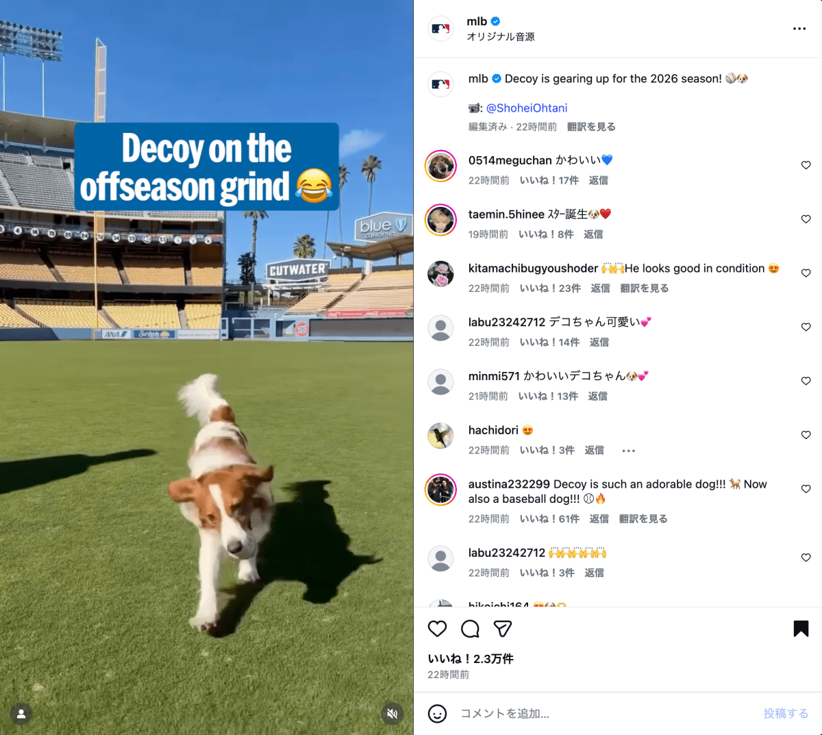 MLB公式Instagramは1月8日、ロサンゼルス・ドジャースの本拠地ドジャー・スタジアムで元気いっぱいに走り回るデコピンの様子を動画で公開した。「Decoy is gearing up for the 2026 season!」と添えられた投稿では、来季を見据えて調整中とも感じさせる軽快な動きが注目を集めている。