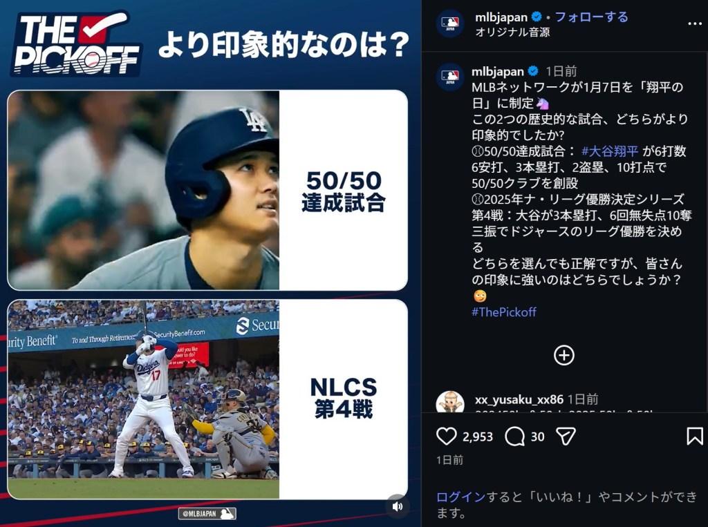 MLBは1月9日、日本公式Instagramを更新。MLBネットワークによって、1月7日が、大谷翔平(31)を称える記念日「翔平の日」に制定されたことを伝えた。あわせて、2024年、大谷が「50/50」達成した試合と、2025年のナ・リーグ優勝決定シリーズ(NLCS)第4戦、どちらがより印象的なものだったかをフォロワーへ問いかけ、大きな反響を呼んでいる。