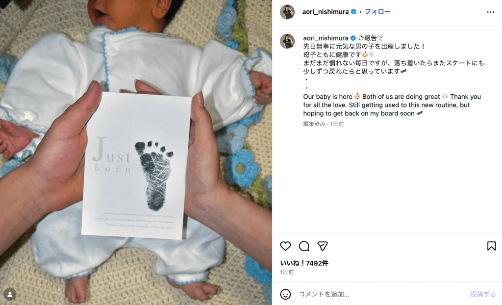 西村は「ご報告」と題した投稿で、無事に出産を終えたことを報告。さらに「Just born」と書かれた紙と小さな足形を写した写真を誕生したばかりの赤ちゃんとともに公開した。「まだまだ慣れない毎日ですが、落ち着いたらまたスケートにも少しずつ戻れたらと思っています」と、今後についても言及している。