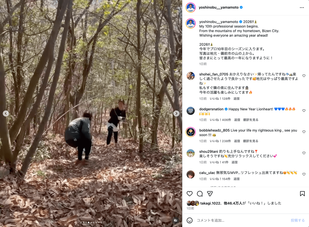 MLBロサンゼルス・ドジャースの山本由伸(27)が1月11日、自身のInstagramを更新し、帰国中のオフショットを公開した。投稿では、地元・岡山県備前市で過ごす様子を写真と動画で紹介。「写真は地元・備前市の山の上から。皆さまにとって最高の1年になりますように!」と、英語と日本語で新年のメッセージをつづっている。