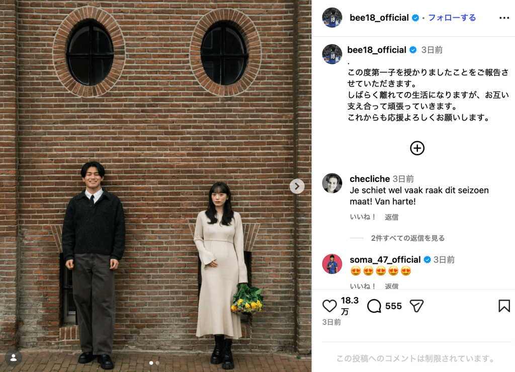 この投稿にはInstagramユーザーから「おめでとうございます」「2人とも大好きだからほんと嬉しいよー」「綺世がパパになるぅぅぅ」「母校の決勝進出日に報告はやりますねぇ」「いつか鹿島でお子さん見れる日を楽しみにしています!」と祝福のコメントが寄せられた。