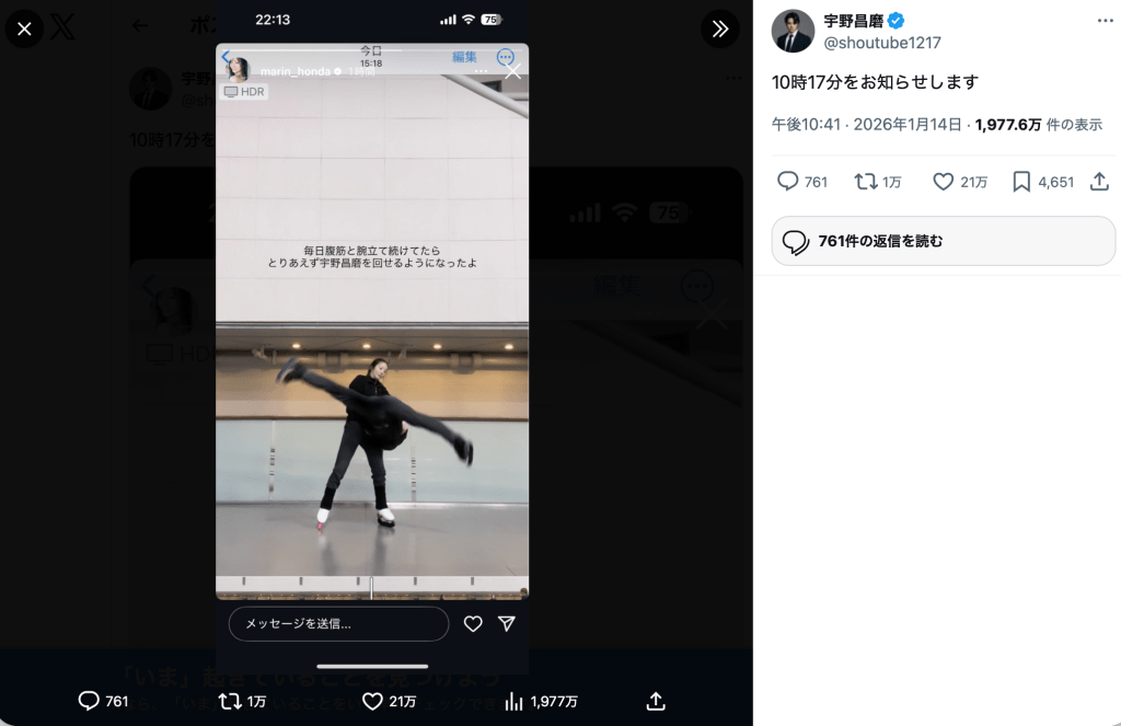 本田のストーリーズには「毎日腹筋と腕立て続けてたらとりあえず宇野昌磨を回せるようになったよ」と本田が宇野を持ち上げて回転させる様子が投稿されていた。これを受け、宇野は「10時17分をお知らせします」と両足の開脚角度を時計にたとえてユーモアたっぷりにつづった。