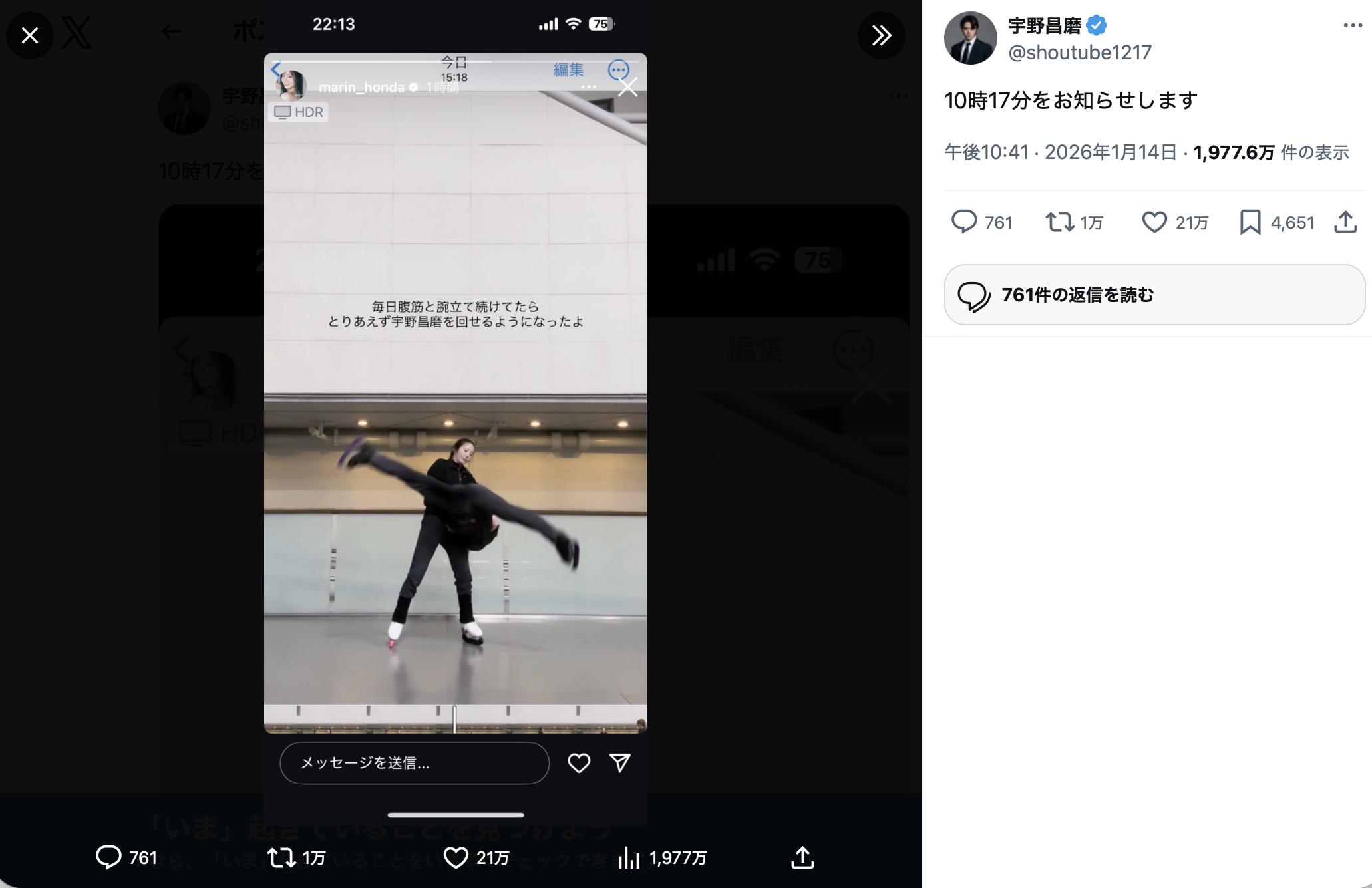 宇野昌磨、本田真凜との“ラブラブ”回転2ショットにボケツッコミ 反響「微笑ましくて大好き」「一生見てられる」