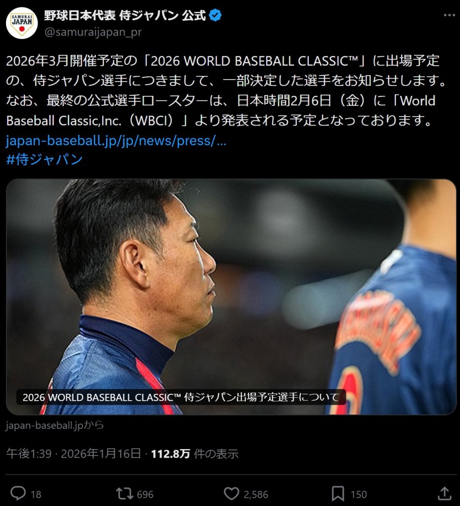 野球日本代表 侍ジャパンは1月16日、公式Xを更新。WBCに出場する新たな11名のメンバーを発表し、ネットで大きな盛り上がりを見せている。