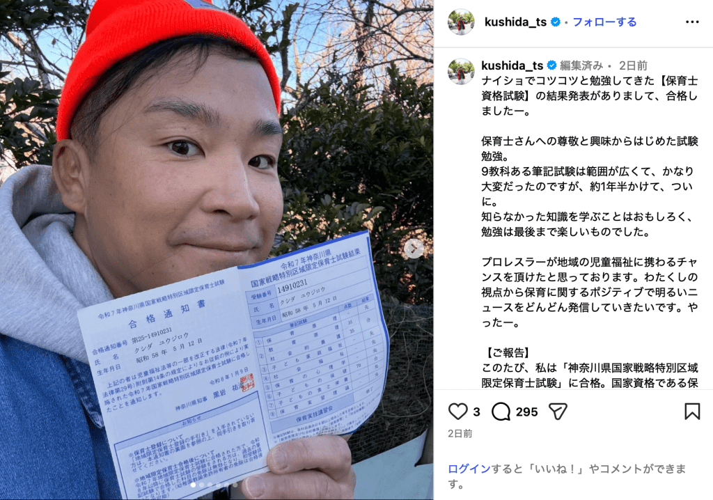 42歳プロレスラーが保育士資格試験に合格! 「生き方素敵です」「日本一安全な保育園になりそう」と祝福の声