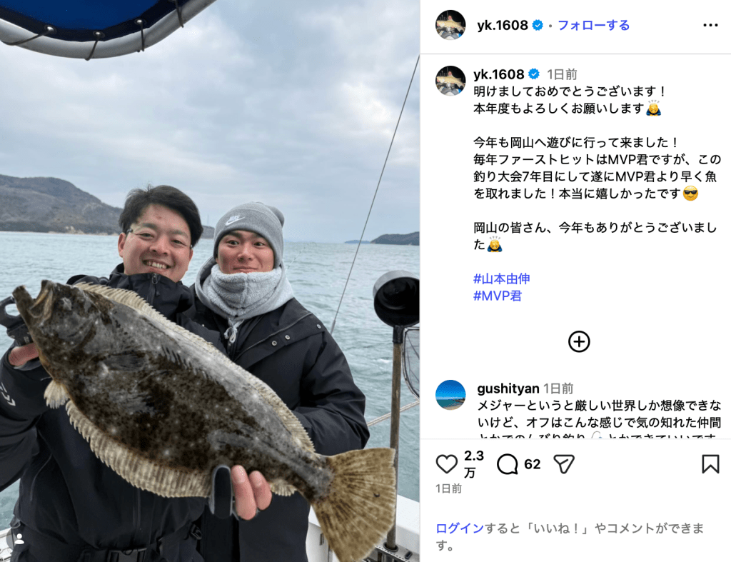 「明けましておめでとうございます!本年度もよろしくお願いします」と投稿されたのは、大きな魚を持ってほほ笑む黒木と山本の写真。山本の地元でのオフを楽しんだ様子だった。