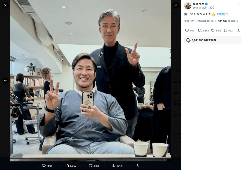 公開された写真では、美容室の鏡越しにピースサインを決める棚橋の姿が写されている。襟足はすっきりと整えられ、全体的にコンパクトな短髪スタイルに。落ち着いた表情と相まって、爽やかさと大人の余裕が感じられる一枚となっている。