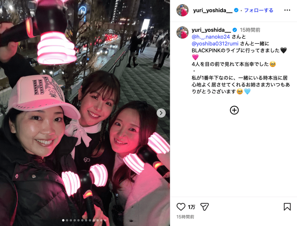「一緒にBLACKPINKのライブに行ってきました」と投稿されたのは、帽子をかぶった葭葉と吉田、林のスリーショット。ハンマー型の公式ペンライトを持ってほほ笑んでいる。その他合わせて12枚の写真が投稿された。