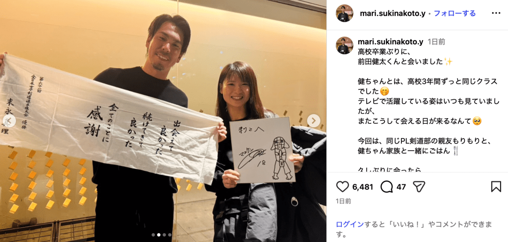 剣道女子で全日本女子選手権優勝の末永真理(37)が1月23日、Instagramを更新。PL学園の同期である東北楽天ゴールデンイーグルス所属の前田健太(37)との再会を報告した。