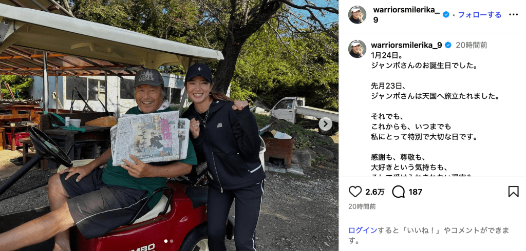 この投稿にはInstagramユーザーから「愛弟子にここまで言われてジャンボさんは本当に幸せですね」「いい写真ですね!」「必ず天国から見守ってくれています」「いつまでも応援してますよー」といったコメントが寄せられた。