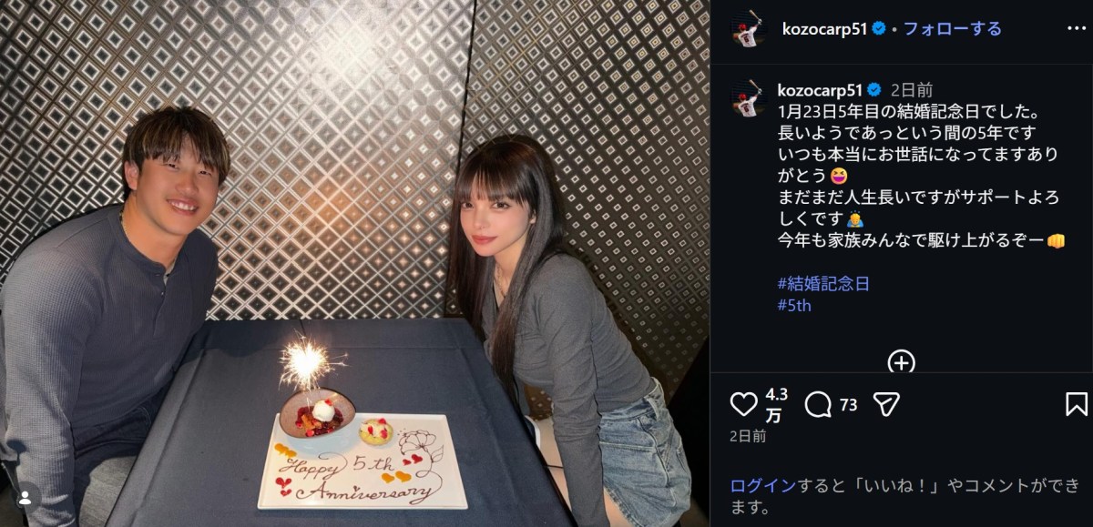 広島東洋カープの小園海斗(25)が1月24日、Instagramを更新。モデルで妻の渡辺リサ(23)との「結婚5周年」を報告し、幸せいっぱいのプライベートショットを投稿した。