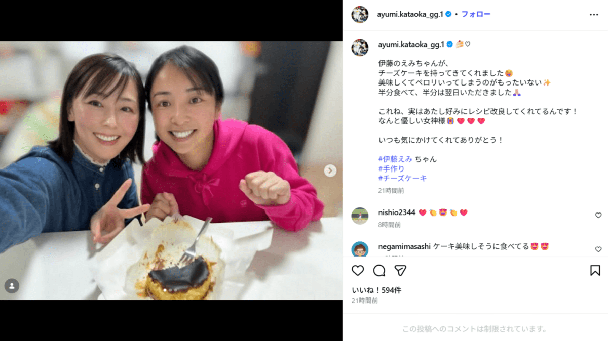 片岡は「伊藤のえみちゃんが、チーズケーキを持ってきてくれました 」と報告。投稿された写真には伊藤が作ったチーズケーキが写っており、「これね、実はあたし好みにレシピ改良してくれてるんです! なんと優しい女神様 」と、自分専用にカスタマイズされていることに感激したことをつづっている。