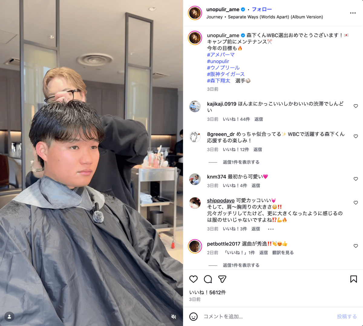 プロ野球・阪神タイガースの森下翔太(25)が1月26日、unopulir京橋店 店長の公式Instagramに登場。ヘアカットの様子を収めた動画が公開された。投稿では「森下くんWBC選出おめでとうございます! キャンプ前にメンテナンス」と紹介され、キャンプインを控えたタイミングで散髪に臨む姿が映し出されている。