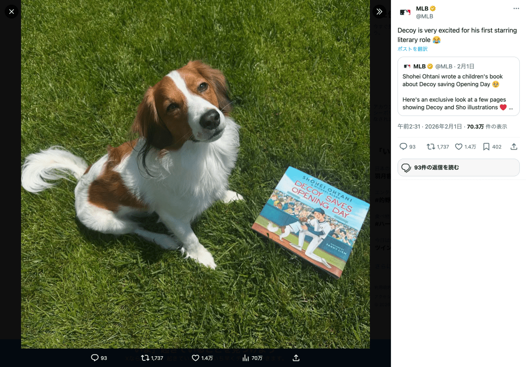 MLBは2月1日、公式Xを更新し、ロサンゼルス・ドジャースの大谷翔平(31)の愛犬「デコピン」が初の主演作となる絵本を前にした写真を公開した。投稿では「Decoy is very excited for his first starring literary role」と紹介され、芝生の上でお座りするデコピンの姿が注目を集めている。