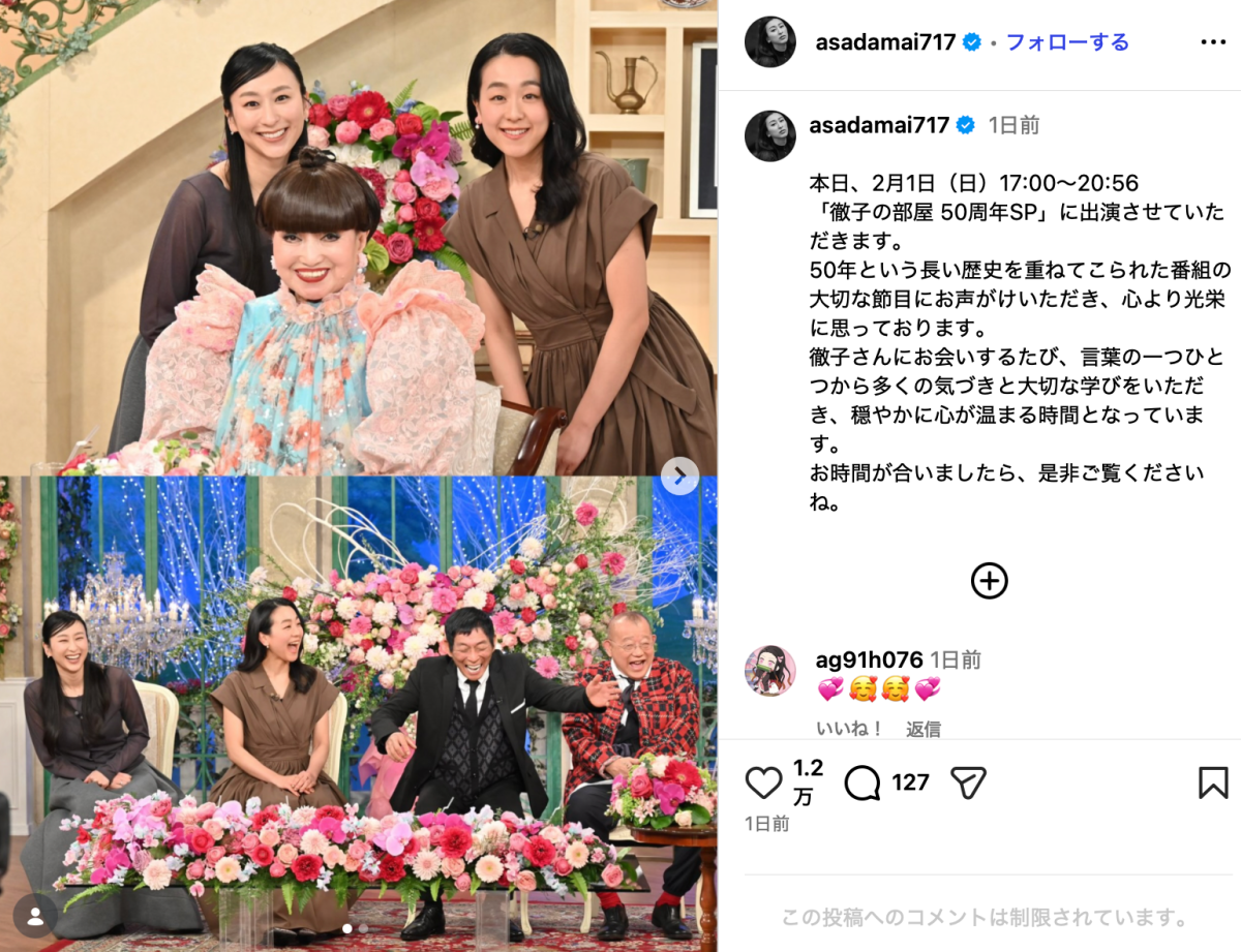 元フィギュアスケート選手でタレントの浅田舞(37)が1月31日、Instagramを更新。2月1日放送のテレビ朝日系「徹子の部屋 50周年SP」の出演写真を投稿した。