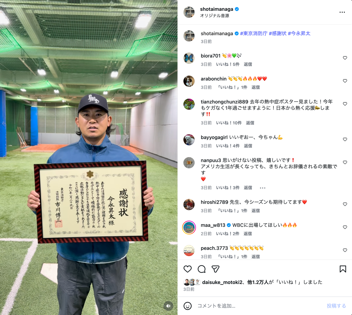 この投稿には、Instagramユーザーから「去年の熱中症ポスター見ました! 今年もケガなく1年過ごせますように!」「東京消防庁の感謝状って、凄いですね」「今永選手、今年も引き続き応援します 今年の夏も熱中症気を付けます」「今永さんだからこそ水分補給の大切さの説得力が違う!」といった声が寄せられている。