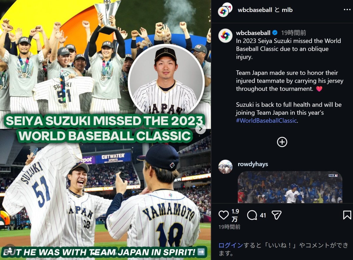 MLBは2月6日、公式Instagramを更新。侍ジャパンの鈴木誠也(31)について、WBC前回大会の感動的なエピソードを紹介し、世界中から反響が寄せられている。