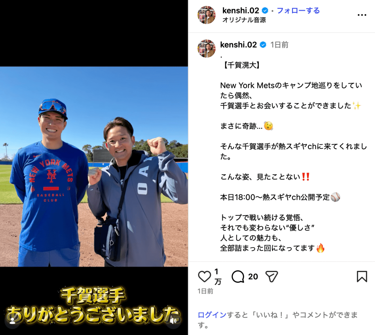 「New York Metsのキャンプ地巡りをしていたら偶然、千賀選手とお会いすることができました」と投稿されたのは、杉谷と千賀がキャンプ地で邂逅する動画。杉谷は千賀を前にして「嬉しっ!」と驚き、千賀も「めっちゃビックリしたっす」と笑顔で談笑していた。杉谷と千賀の対談の様子は杉谷のYouTubeチャンネル「熱スギヤch」で公開されている。