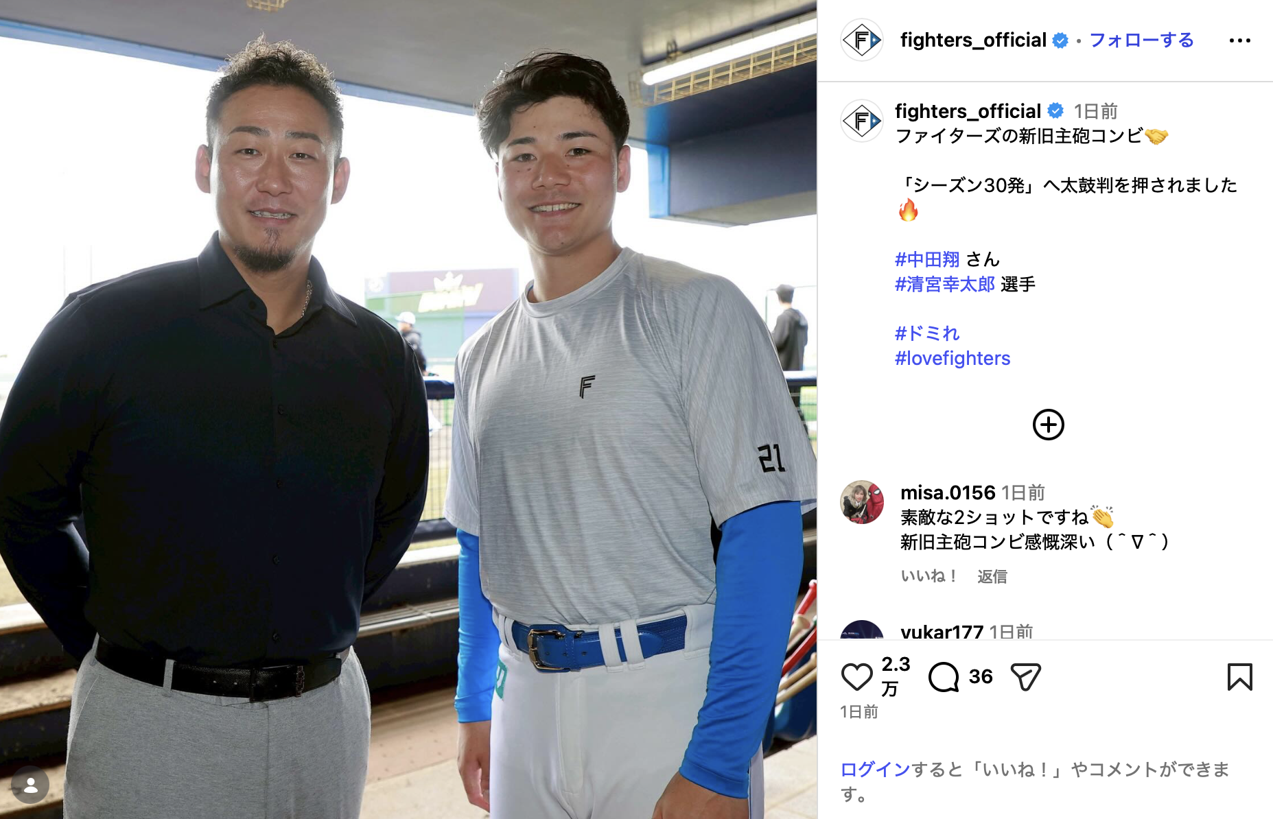 「なんか泣ける」中田翔&清宮幸太郎、“新旧主砲”の2ショットに反響 笑顔で並ぶ「師弟コンビ」がエモすぎる