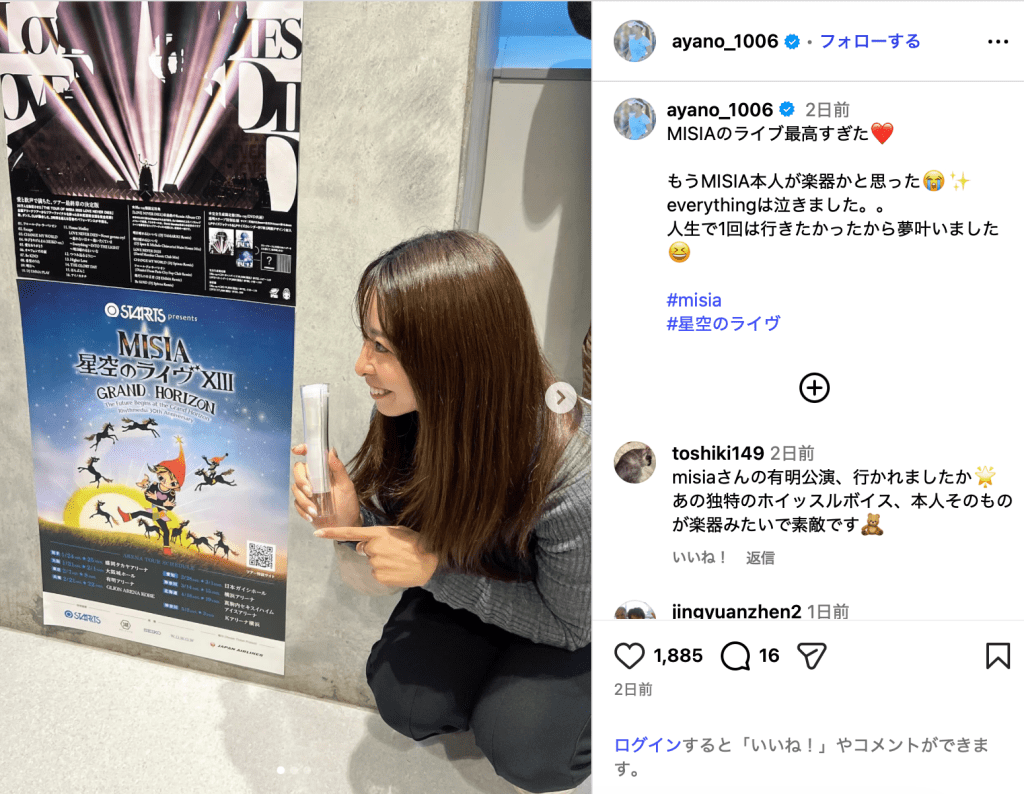 園田彩乃「夢叶いました」 MISIAライブを訪れ名曲に感涙 「参戦してたんだね」「髪の毛綺麗」と注目集まる
