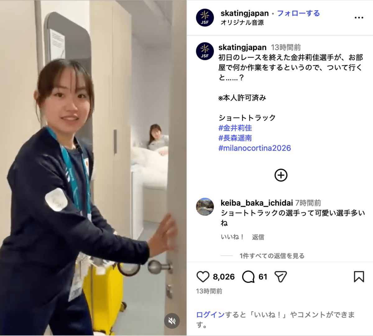 「初日のレースを終えた金井莉佳選手が、お部屋で何か作業をするというので、ついて行くと……? ※本人許可済み」と公開されたのは、金井がカメラマンを部屋に案内する動画。カメラを向けられた長森は訳もわからずピースをするも、日本スケート連盟のInstagramとわかると「やぱっ!サイアク!」と驚きの表情を浮かべていた。