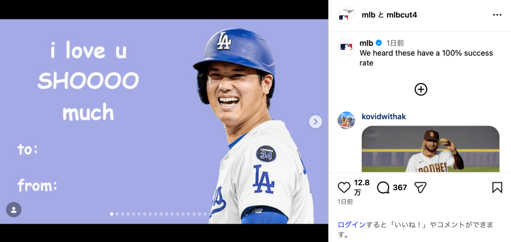 「We heard these have a 100% success rate」と投稿されたのは、バレンタインデーのメッセージカード風の画像。笑顔の大谷と「i love you SHOOO much」というメッセージが書かれている。その他。ニューヨーク・ヤンキースのアーロン・ジャッジ(33)やシカゴ・カブスの鈴木誠也(31)らの写真も投稿され、12万8000いいねの反響を呼んでいる。