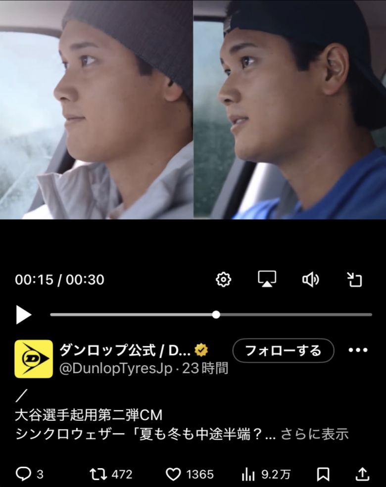 米大リーグ・ドジャースの大谷翔平(31)が出演するダンロップの新CMが公開され、話題を集めている。ダンロップ公式Xは2月12日、CM動画を投稿し、「大谷選手起用第二弾CM」として紹介。次世代オールシーズンタイヤの魅力を、大谷が一人二役で表現している。
