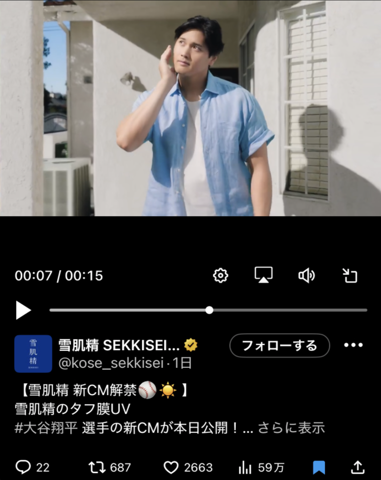 米大リーグ・ドジャースの大谷翔平(31)が出演するコーセーのスキンケアブランド「雪肌精」の新CM「雪肌精のタフ膜UV」篇が公開され、注目を集めている。雪肌精公式Xは2月12日、「雪肌精 新CM解禁」として動画を投稿し、日やけ止めの魅力を、爽やかな夏の装いとともに伝えている。CMは13日から全国で放送開始となる。