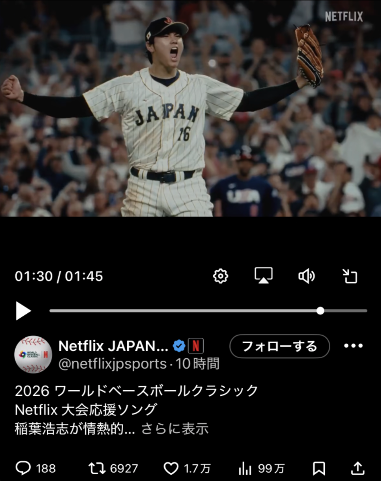 動画配信サービス「Netflix」は2月13日、公式Xを更新し、2026年ワールドベースボールクラシック(WBC)の大会応援ソングとして、B’zの稲葉浩志(61)が歌う「タッチ」のスペシャルムービーを公開した。投稿では「2026 ワールドベースボールクラシック Netflix 大会応援ソング」と紹介され、WBCの名場面とともに、情熱的な歌声が響く映像が披露されている。