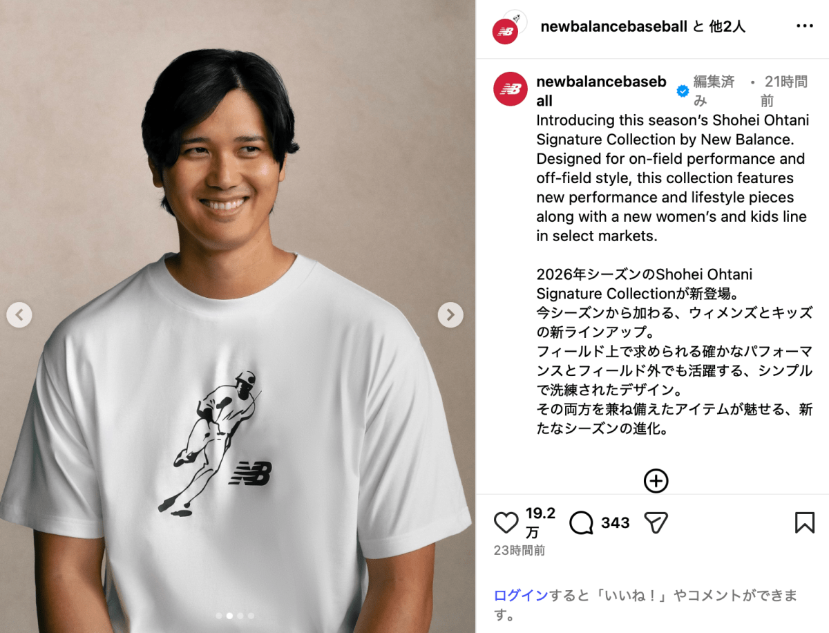 「2026年シーズンのShohei Ohtani Signature Collectionが新登場」と公開されたのは、大谷がニューバランスの新コレクションに身を包む写真。キッズモデルと並び、青のフーディとアームスリーブを着用した大谷や、漫画家の井上雄彦(59)がデザインした大谷のシグネチャーロゴが描かれたTシャツを着た大谷、ジャージ姿の大谷の写真などが投稿された。大谷は2023年からニューバランスとアスリート契約を結んでいる。