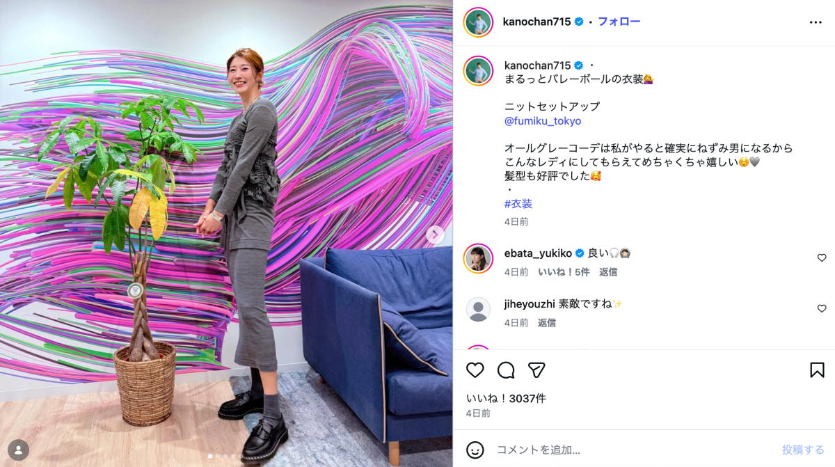 狩野は「まるっとバレーボールの衣装」と題し、グレーのニットセットアップを着こなす姿を披露。後ろで束ねただけの髪型がふんわりと優しい雰囲気を演出し、全身から女性らしさがあふれている。狩野は「オールグレーコーデは私がやると確実にねずみ男になるから こんなレディにしてもらえてめちゃくちゃ嬉しい」とコメントし、スタイリングをとても気に入っている様子を見せた。