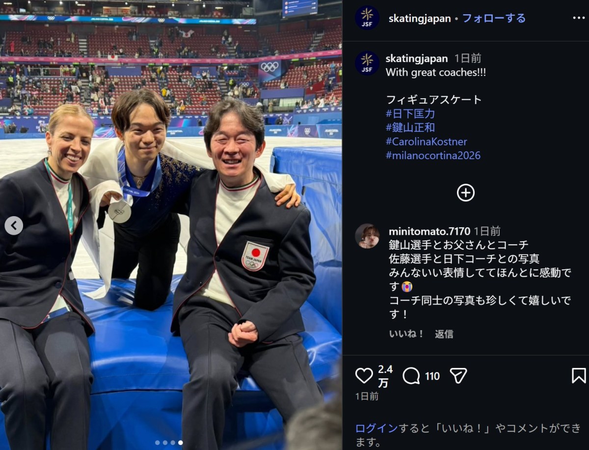 ミラノ・コルティナ五輪で2大会連続銀メダルを獲得した鍵山優真(22)が、14日、日本スケート連盟の公式Instagramに登場。その快挙を支えたコーチで、鍵山の父・正和さんの笑顔あふれるオフショットに、ファンからねぎらいの声が集まっている。